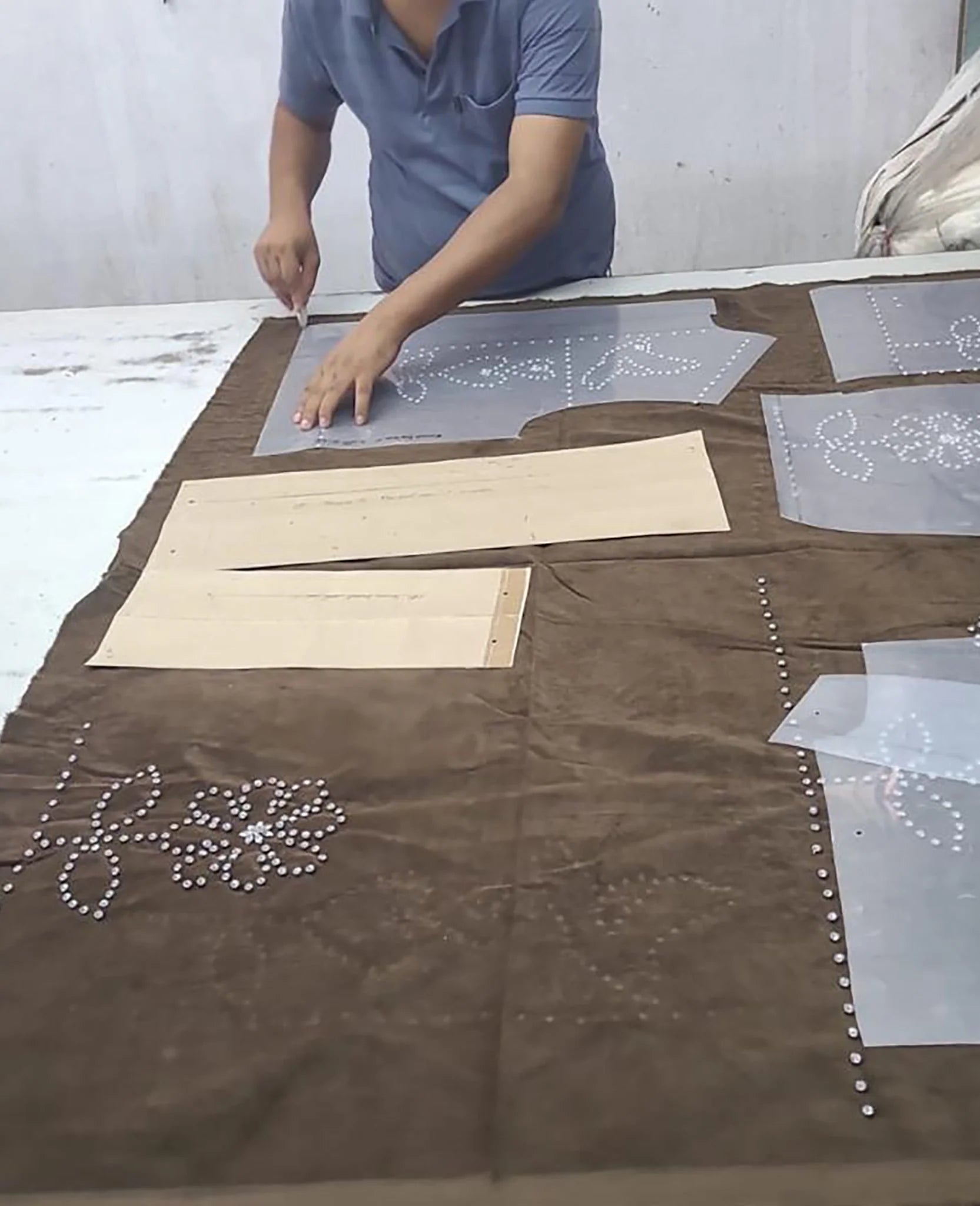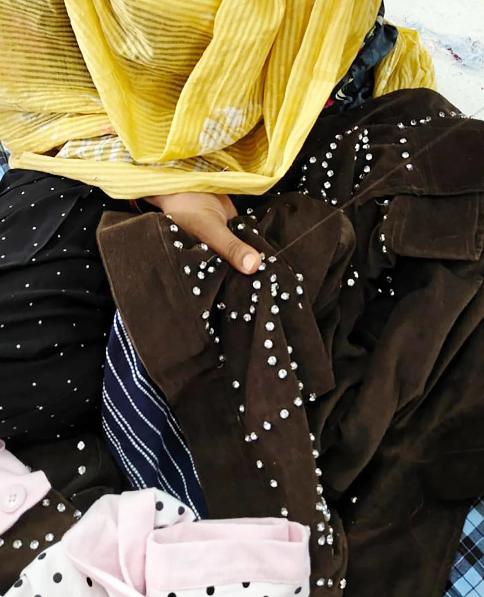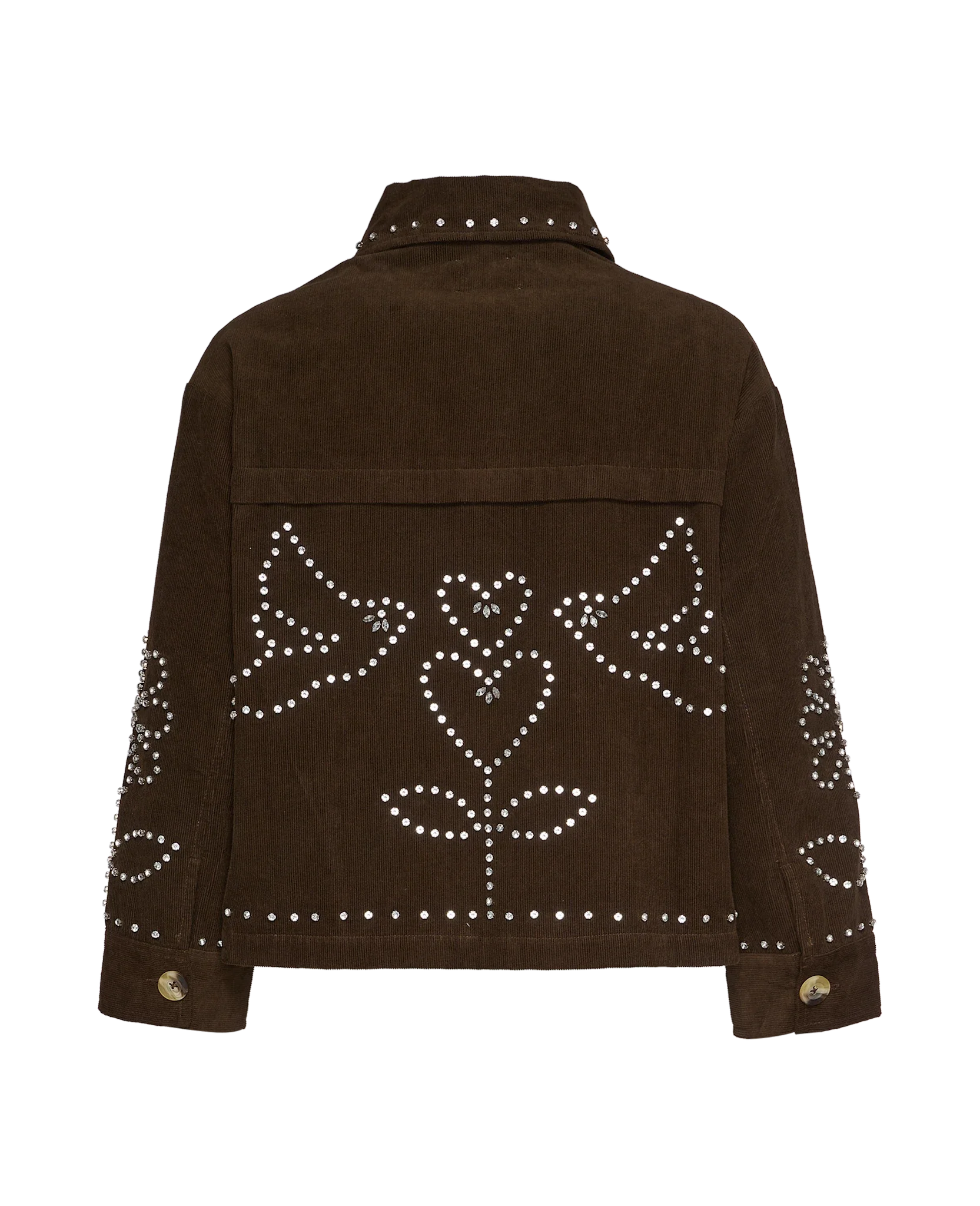 Emme Jacket is a short, boxy jacket made in leftover cotton baby corduroy. It has regular-fit sleeves with buttoned cuffs. The jacket features a large collar with hidden brown bone-look buttons at the placket and two single welt pockets at the front. The topstitching gives the jacket a workwear-inspired look, and it is delicately embellished with birds and flowers made of rhinestones. The jacket is lined with leftover cotton with a flower print.