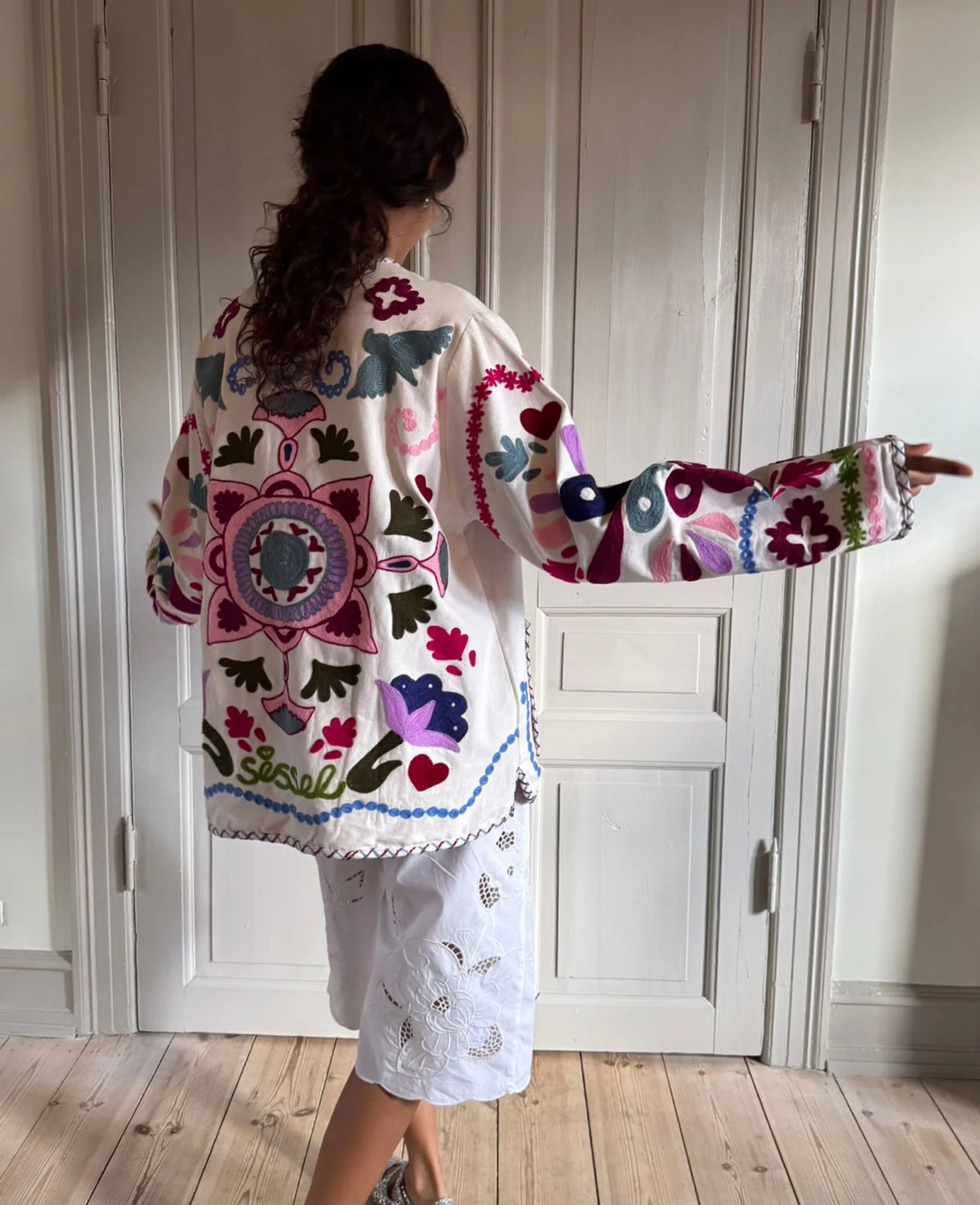 Maggie Jacket has a casual fit with two pockets at the front. The jacket features buttons at the front placket and is made in cotton canvas. An eye-catching Suzani embroidery is placed all over. This specially designed artwork features flowers, little hearts, a peace dove, and our ‘SE’ signature, symbolizing harmony and togetherness.